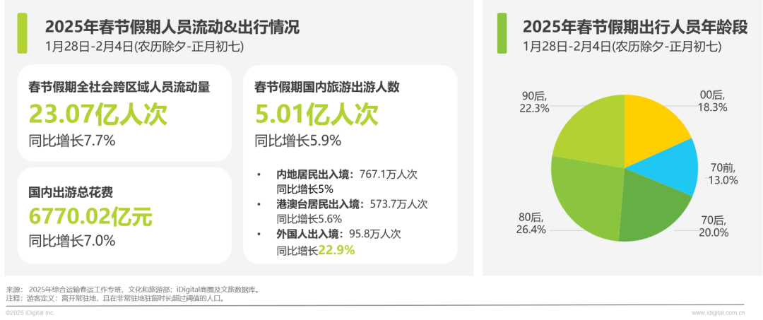 春节受“非遗Buff”加持,国内居民出行及国际游客入境游火热,展现旅游市场新活力。外国人出入境人次同比增长22.9%,彰显中国春节文化国际影响力。出行人群中80后与90后占比近半数,展现消费主力对旅游出行及文化体验的兴趣与追求。