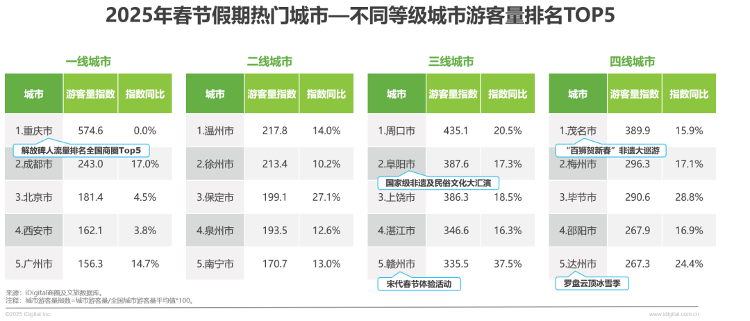 高线城市作为经济及文化中心,京津冀、长三角、粤港澳、成渝等区域人流集中,仍然是热门出游目的地,呈现“强者恒强”的态势,其中重庆市位居榜首。与此同时,周口、阜阳、茂名等三四线城市在春节假期的游客量指数显著增长,或因非遗文化体验、北赏雪南避寒等特色资源成功“出圈”,反映出春节假期人口流动的多元化以及下沉市场消费的升温。