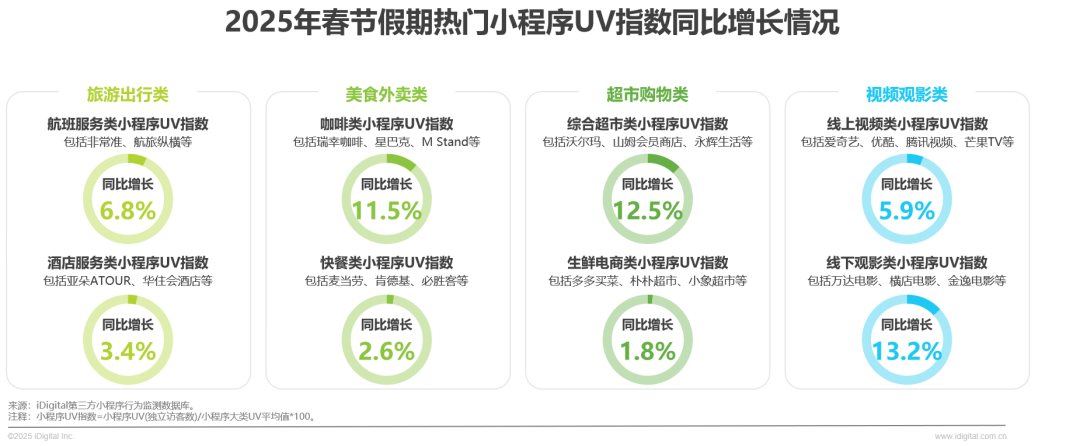 2025年春节,小程序访问数据揭示人口流动下数字化消费趋势。航班服务类小程序UV指数的同比增长,反映返乡与旅游叠加效应及用户对出行信息的日益关注。超市购物类小程序UV指数的增长,不仅折射出春节期间线上购物需求的持续旺盛,更体现了消费者对便捷购物体验与高品质商品组合的双重追求。线上视频、线下观影的小程序热度,或与2025年春节档电影的高关注度相关。