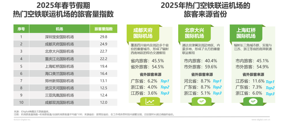 2025年春节假期,深圳宝安机场、成都天府机场、北京大兴机场等空铁联运机场旅客量指数高企,彰显出游热情高涨。成都天府机场的省外旅客、北京大兴国际机场及上海虹桥机场的市外旅客均过半,凸显长距离出行需求的旺盛。空铁联运服务的持续升级,不仅拓宽了旅客出行选择,更激发了出游意愿,进而推动出游人数与旅游消费的双重增长。未来,随着服务的不断深入,空铁联运将进一步提升运输效率,促进区域经济发展。
