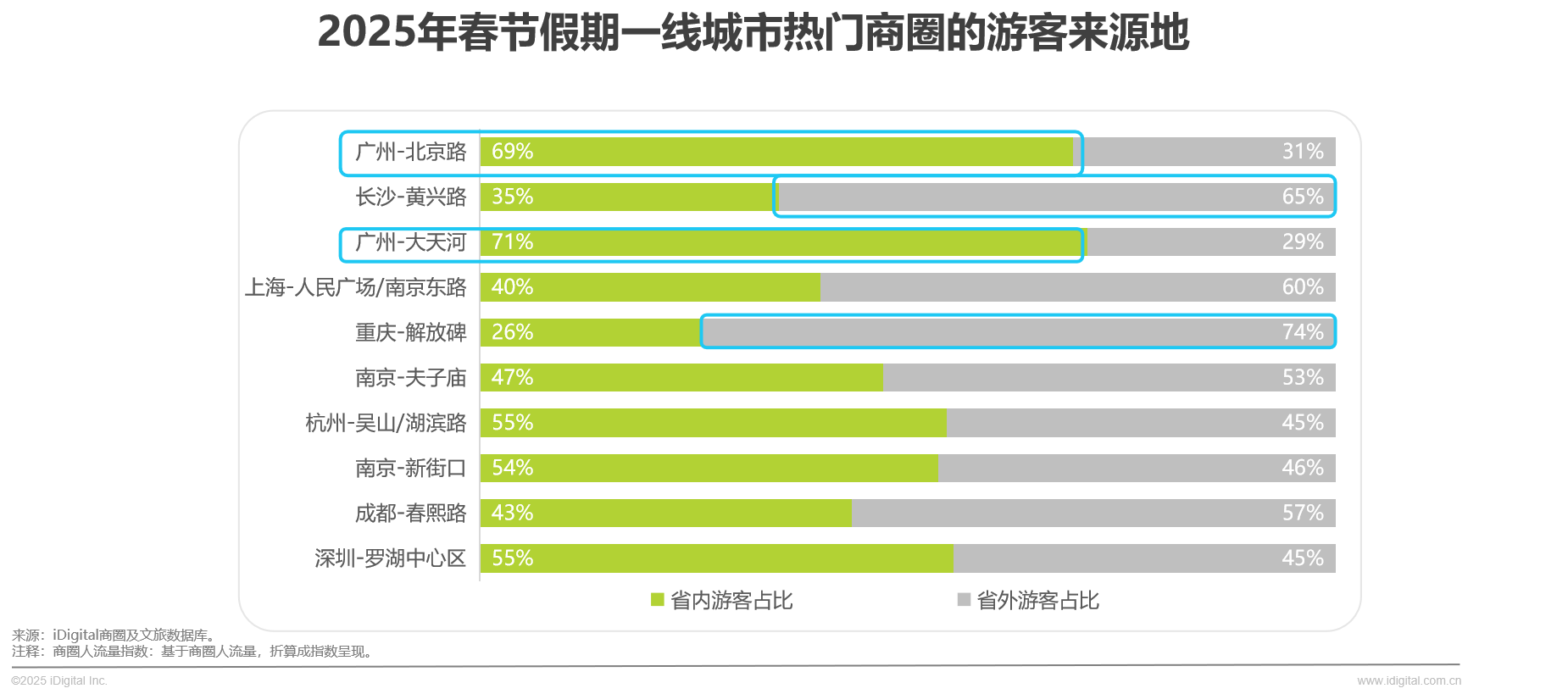 2025年春节假期,文商旅结合驱动客流增长的模式再次得到印证。一线城市出现本地居民+外地游客的“双核吸力效应”。广州北京路、广州大天河的省内游客占比较高,展现出较强的本地人流集聚能力。而长沙黄兴路与重庆解放碑,吸引了较高比例的外地游客,体现了跨省流动促进商圈繁荣的“溢出效应”。数据表明,无论是高本地连接度的商圈还是强外地吸引力的商圈,均展现出独特的竞争优势。文商旅联动,以文旅带商圈,或将是未来提升商圈活力、促进消费增长的关键路径。