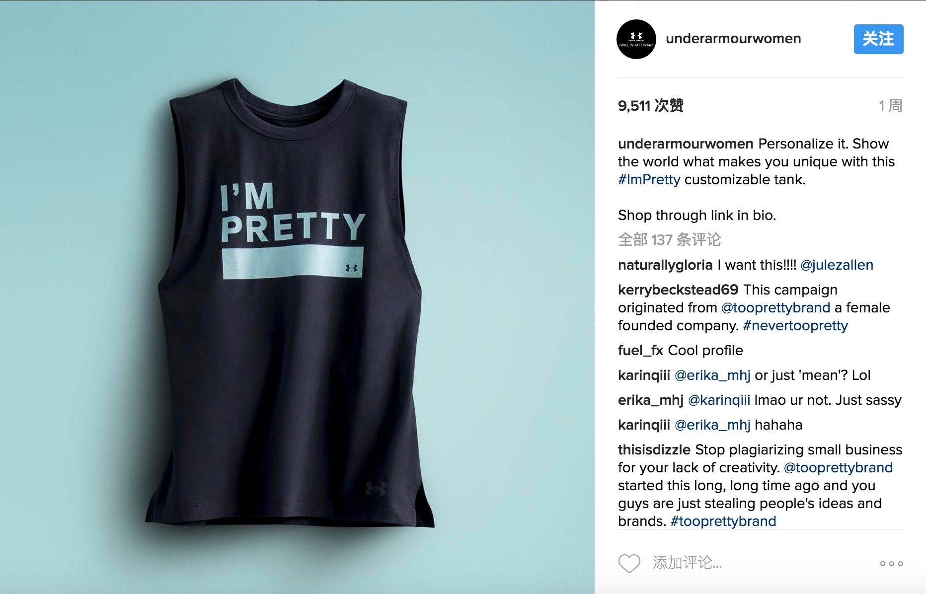 除了线上的广告片之外,Under Armour还上线一个表情包生成器,让大家在 "I’m Pretty……”填空然后生成图片一键分享到自己的社交媒体上。与此同时,这个运动品牌推出了一款印着“I’m Pretty……”的运动上衣,然后也可以自己用油性笔写上你想要表达的意义,I’m Pretty sexy之类的,只要你高兴。