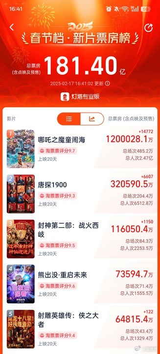 据灯塔专业版,截至2月17日16时41分,影片《哪吒之魔童闹海》内地单一市场票房(含预售)突破120亿,持续刷新全球单一市场票房纪录。