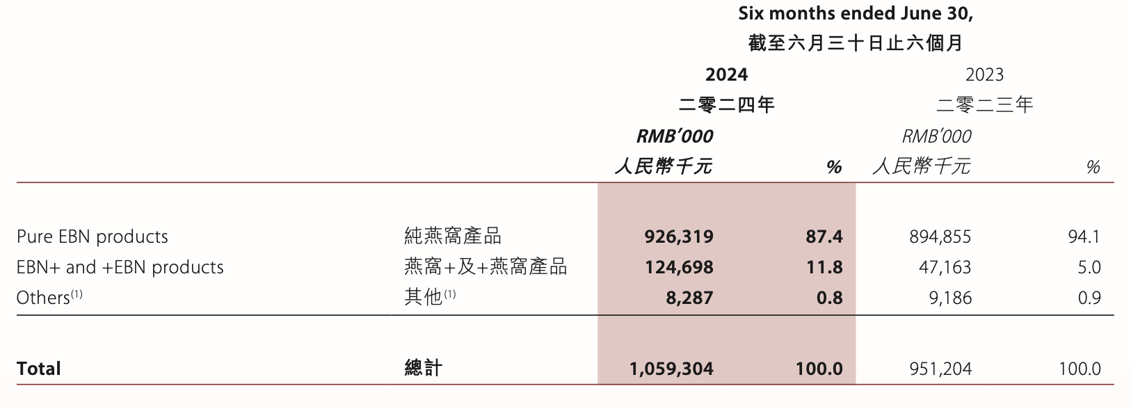 在产品方面,燕之屋也试图打造更丰富的矩阵以覆盖更多人群。2024上半年,燕之屋推出了生椰桃胶燕窝、王一博同款碗燕、整根人参燕窝饮品、燕窝粥、燕窝肽天然苏打水等多款新品。而其燕窝+及+燕窝业务所产生的收入同比增长164.4%至1.24亿元。但其11.8%的营收占比也意味着这一业务板块仍未能成业绩支柱。