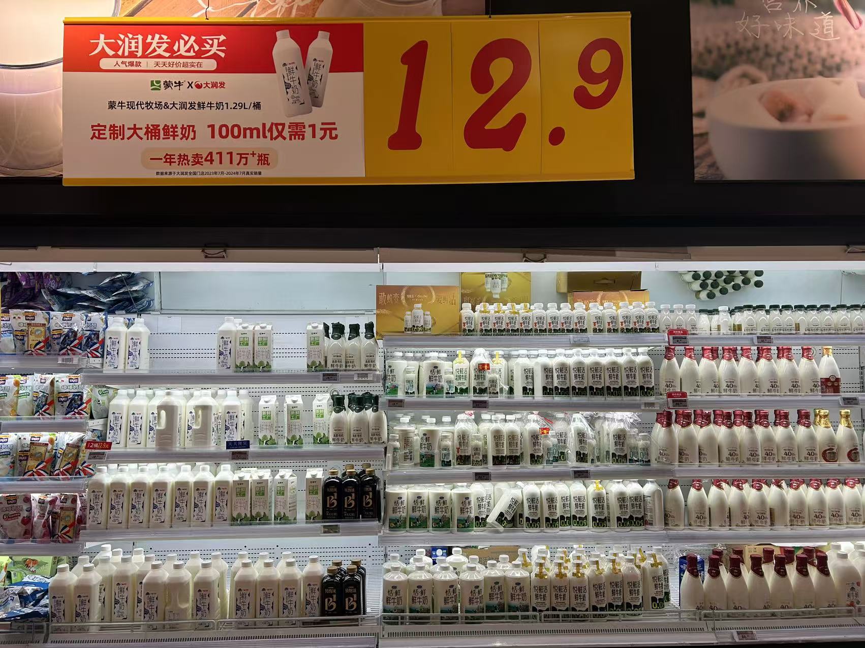 其中,大润发常见以多规格捆绑的形式进行折扣降价,例如蒙牛旗下“现代牧场”品牌与大润发联名的鲜奶,单瓶规格1.29升,如今22.9元可带走2瓶,折合每100ml价格已经下探至不足1元。