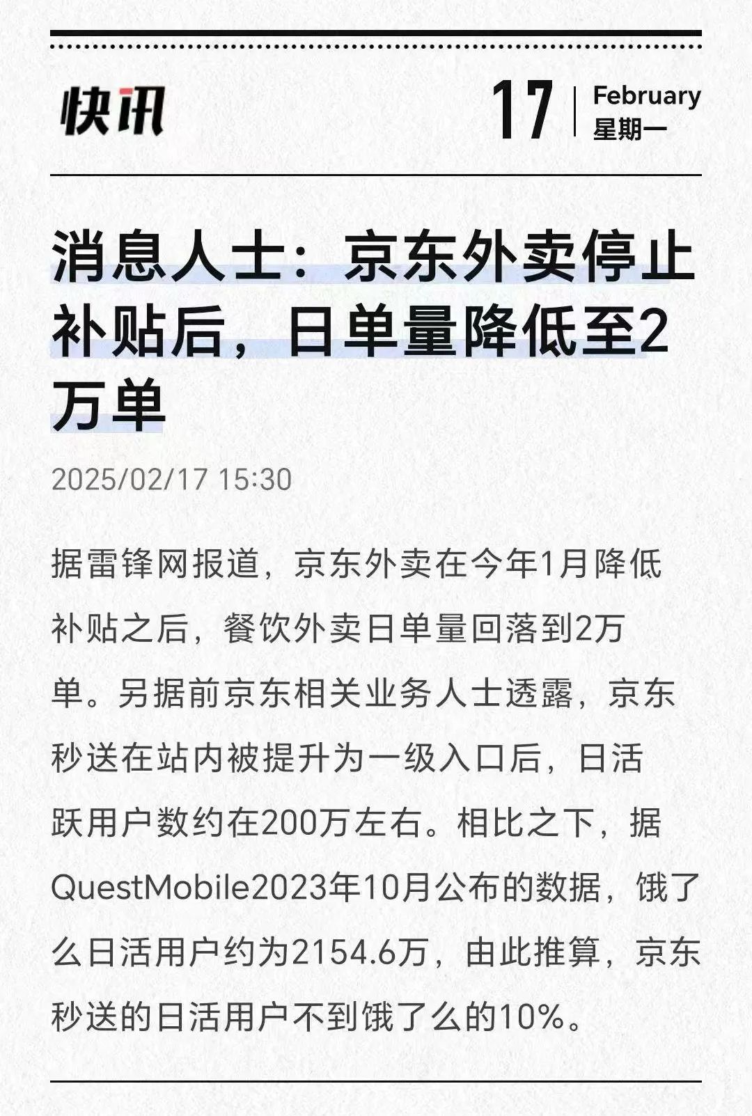 据媒体报道,京东秒送目前日活用户数量在200万左右,不到饿了么的1/10;同时,在今年1月京东外卖停止补贴后,日单量迅速下滑至2万单。这种“停掉补贴就下滑”的窘境,与抖音当初入局外卖如出一辙。