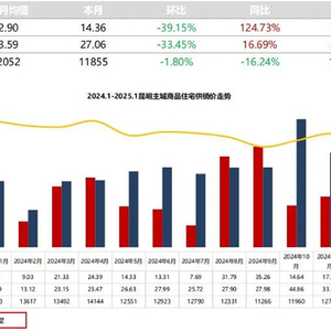 克尔瑞1月月报数据显示,2025年1月,昆明主城商品房成交均价为11252元/平方米,环比下降0.87%,同比下降11.56%;主城商品住宅成交均价为11855元/平方米,环比下降1.8%,同比下降16.24%。因春节传统淡季等原因,该价格处于近一年来的低位。