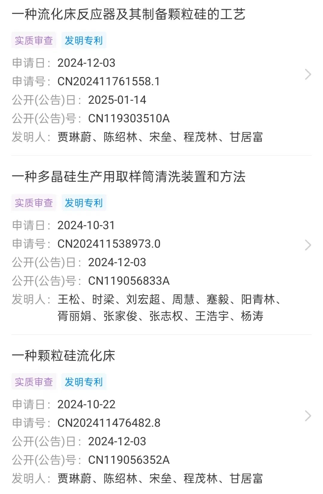 公开资料显示较为关键的有两项:(1)一种颗粒硅流化床:申请日为 2024 年10 月22日,公开号为 CN119056352A。(2)一种流化床反应器及其制备颗粒硅的工艺:申请日为 2024年12月3日,公开号为 CN119303510A。