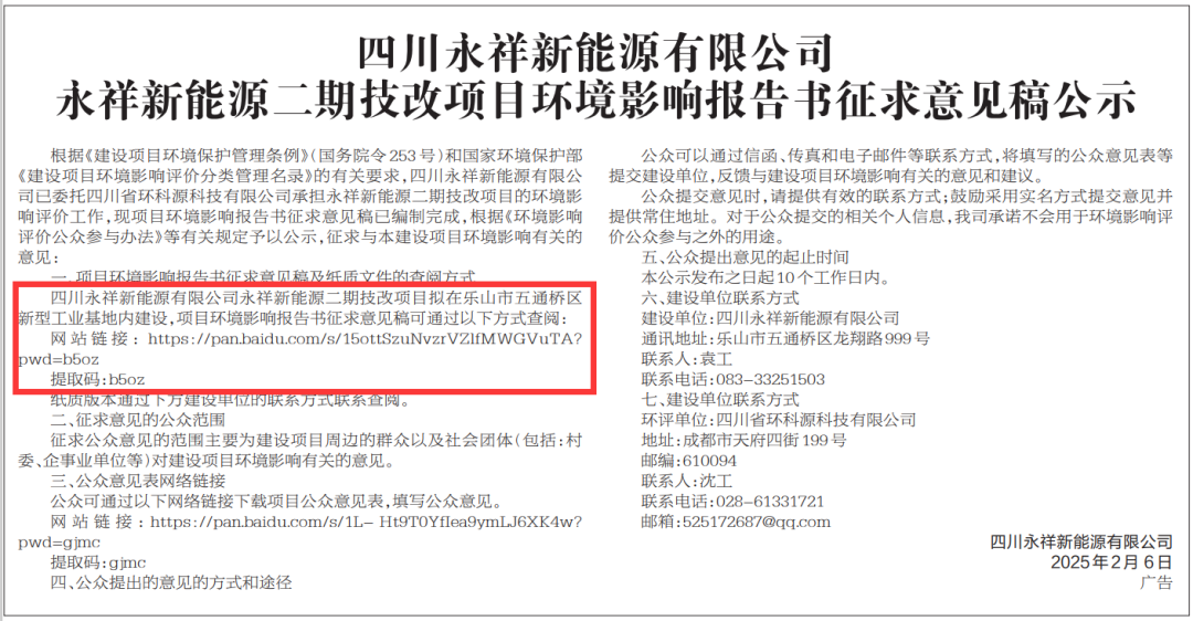 2025年2月7日,乐山日报第2版刊登了《四川永祥新能源有限公司永祥新能源二期技改项目环境影响报告书征求意见稿公示》。