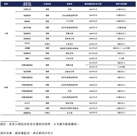 截至目前,中国已获批上市的流感疫苗共有19种,包括10种三价疫苗、9种四价疫苗;还有16款处于临床开发阶段的流感疫苗,包括4种三价疫苗及12种四价疫苗。四价流感疫苗是我国流感疫苗的主力军。据中检院批签发数据,2023年四价流感疫苗的市占率已升至75%。