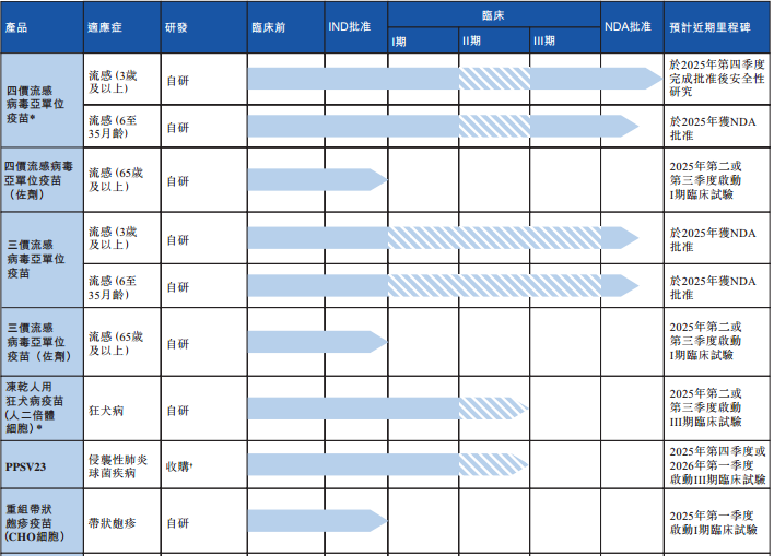 中慧生物正在开发的三价流感病毒亚单位疫苗NDA已获国家药监局受理;在研的23价肺炎球菌多糖疫苗计划于2025年第四季度或2026年第一季度开始III期临床试验;重组带状疱疹疫苗计划于2025年第一季度开始I期临床试验。公司还在开发24价肺炎球菌结合疫苗、mRNA疫苗及重组疫苗、mRNA猴痘疫苗、水痘减毒活疫苗及吸附破伤风类毒素疫苗等。