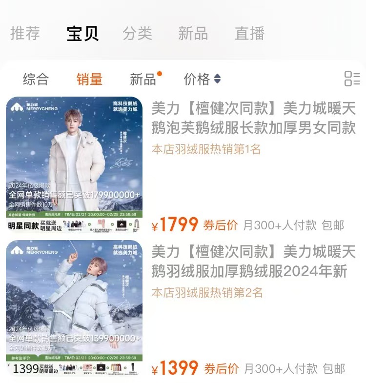 根据久谦中台向界面新闻提供的数据,2025年迄今,美力城在天猫、抖音和京东三个平台上的合计销售额大约能在服装配饰品类中排在第28名。代言人的贡献不容小觑,美力城的宣传物料显示,2024年该品牌最畅销的两件爆款羽绒服全网销量均超过10万件,销售额破亿。这两款产品均为檀健次同款,售价分别为1799元和1399元。