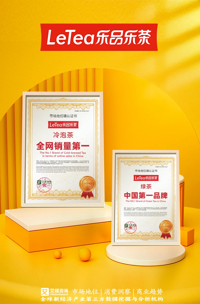 2025年1月,乐品乐茶荣获全球新经济产业第三方数据挖掘和分析机构iiMedia Research(艾媒咨询)授予的“绿茶中国第一品牌”“冷泡茶全网销量第一”两项市场地位确认。