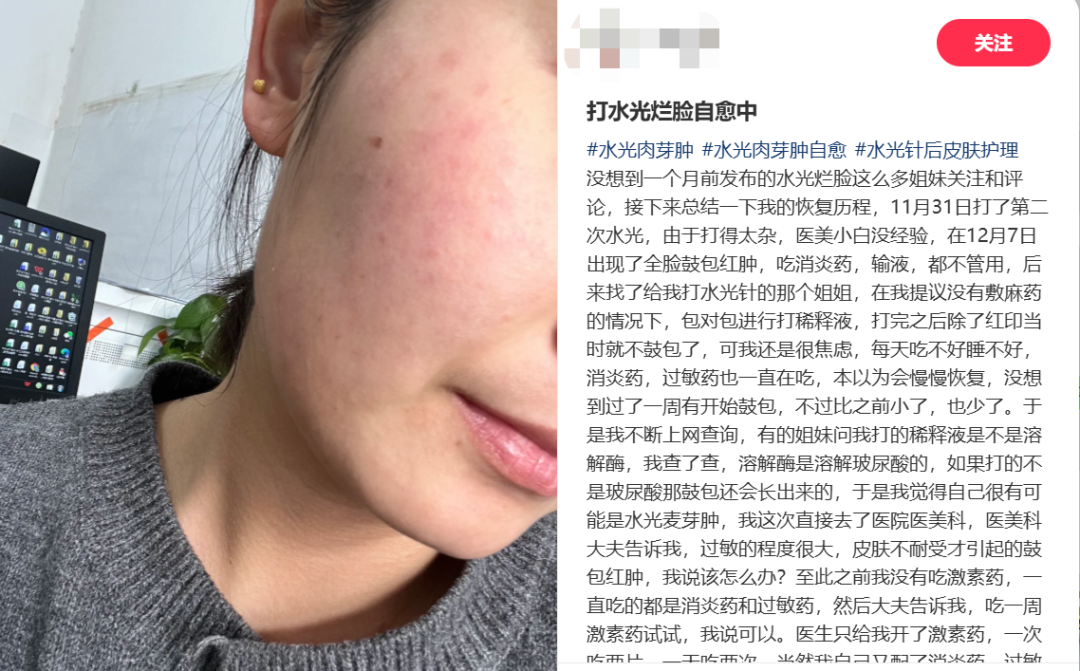 轻医美受到偏爱的原因是风险低、副作用小,然而,低风险不意味着零风险。社交平台有不少用户提到,自己做完微针、水光后开始出现“烂脸”。