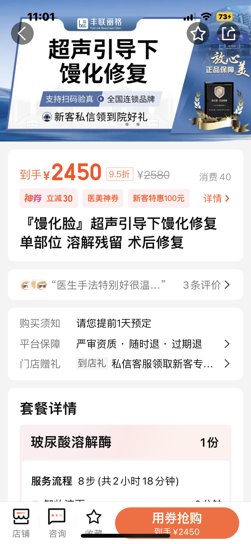 这些修复项目里,最常见的是针对玻尿酸馒化的“溶解酶修复”。“大众点评”平台显示,在北京朝阳区某连锁医美机构注射一次溶解酶大约需要915元。不过,注射溶解酶需要“少量多次”才能见效,只打一次或是一次打多支很难溶解干净。有用户表示,之前全脸注射了“嗨体”填充,为了消除肿胀,已经打了8次溶解酶,花费近万元。