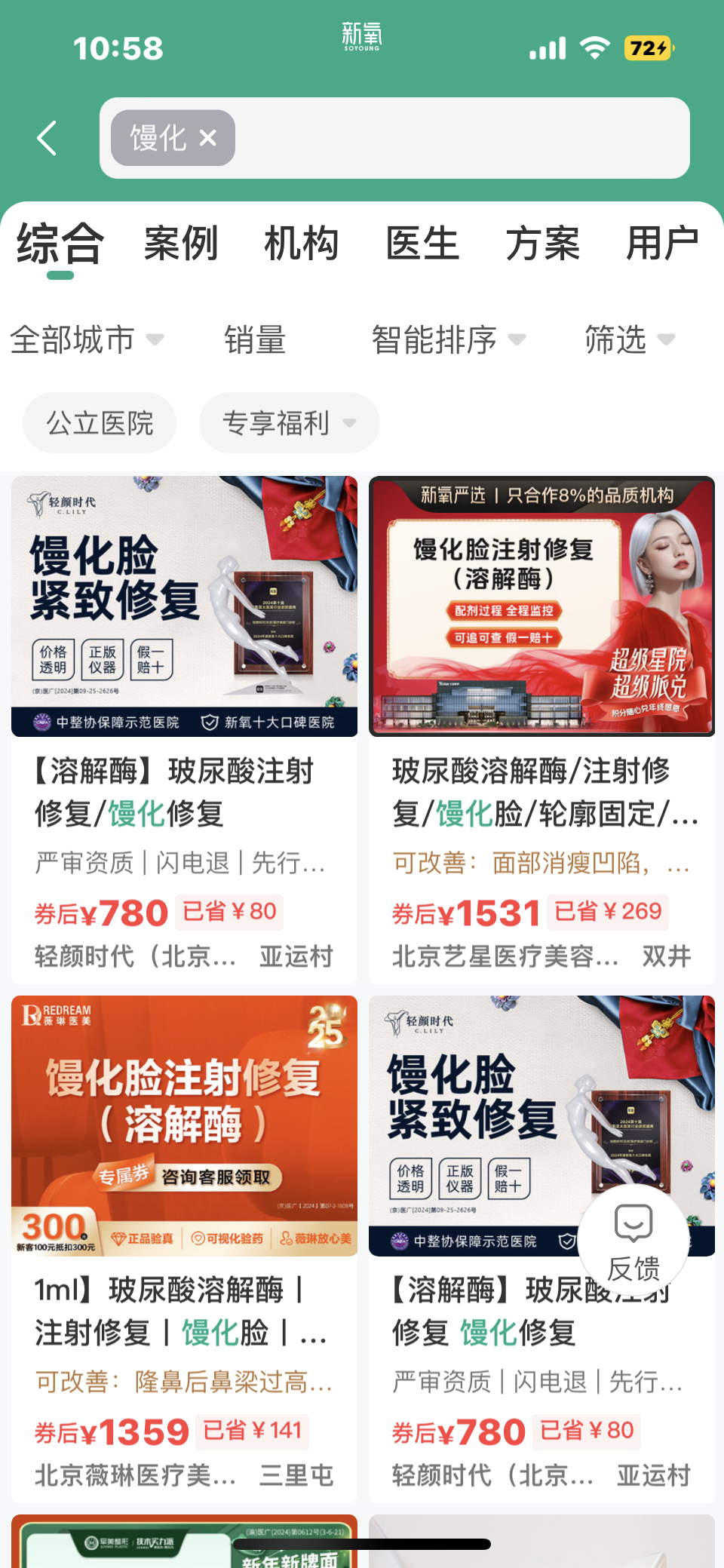 除了溶解酶,超声、射频、激光等技术也被用来修复馒化,但价格比溶解酶更贵一些。根据各医美平台显示,北京“超声引导”类的修复项目,价格多在2000元以上。除此之外,“等离子气化”“超声乳化”等针对馒化的修复项目也层出不穷。