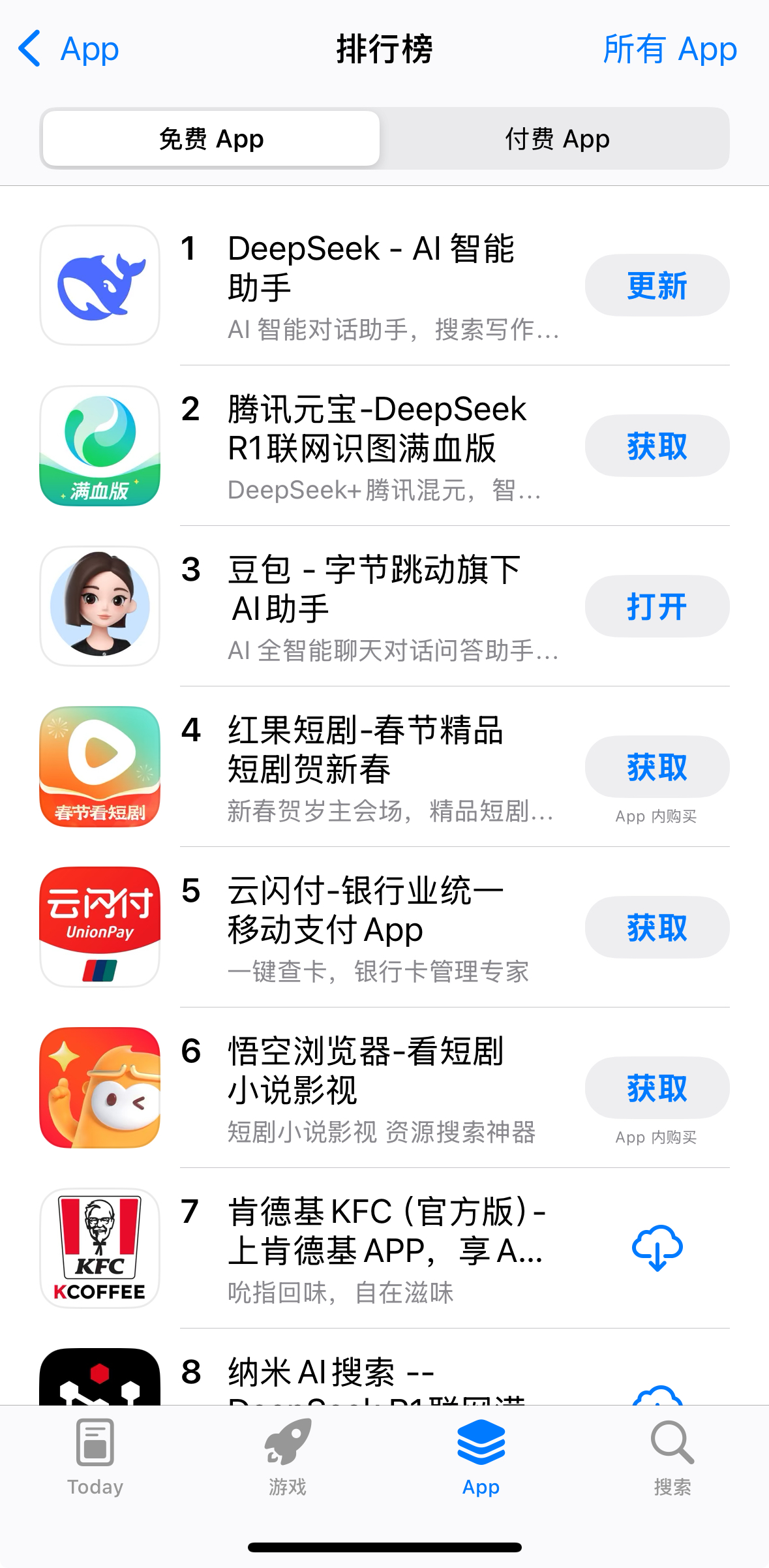 被元宝超越的字节旗下的豆包,此前在大模型应用领域表现突出。截至去年12月,豆包月活量达7523万,是中国月活用户数最多的AI原生应用,在苹果APP免费榜的排名较为靠前。