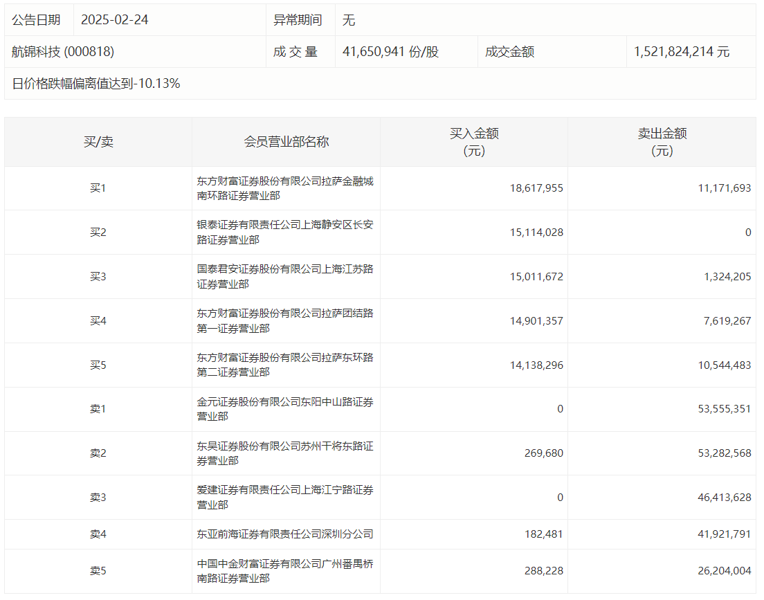 航锦科技2月24日跌停,龙虎榜数据显示,上榜营业部席位全天成交3.31亿元,占当日总成交金额比例为21.72%。其中,买入金额为7852.37万元,卖出金额为2.52亿元,合计净卖出1.74亿元。