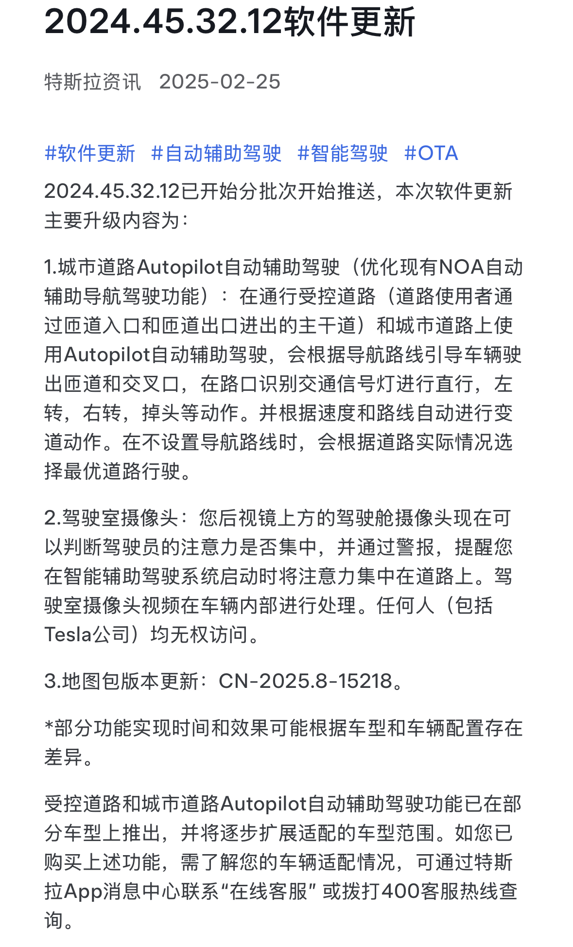 2月25日,特斯拉宣布,开始为中国客户分批次更新软件,推出城市道路Autopilot自动辅助驾驶(优化现有NOA自动辅助导航驾驶功能)。在通行受控道路(道路使用者通过匝道入口和匝道出口进出的主干道)和城市道路上使用Autopilot自动辅助驾驶,会根据导航路线引导车辆驶出匝道和交叉口,在路口识别交通信号灯进行直行、转、右转、掉头等动作,并根据速度和路线自动进行变道动作。在不设置导航路线时,会根据道路实际情况选择最优道路行驶。