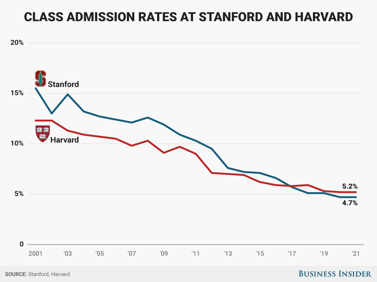 申请名牌大学的难度比十年前要大得多。如今,哈佛和斯坦福会拒掉近95%的学生。而20年前,这两所大学的录取率还是两位数。2001级大学生(于1997年被录取)被斯坦福大学录取的几率为15.5%,被哈佛大学录取的几率为12.3%。