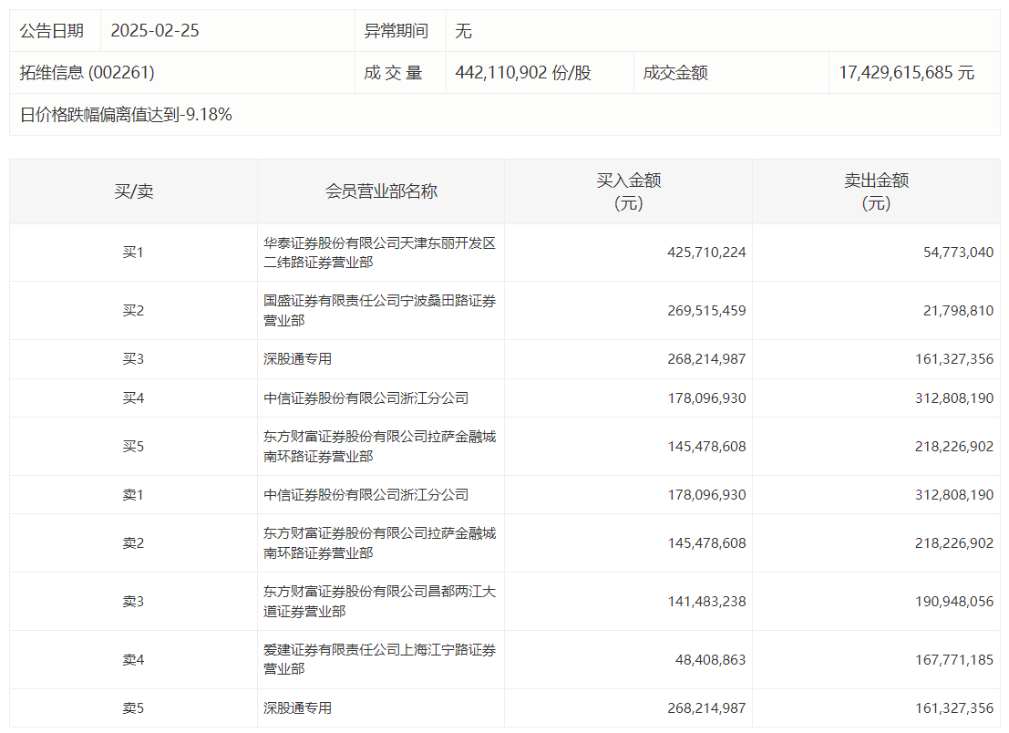 拓维信息2月25日跌停,龙虎榜数据显示,上榜营业部席位全天成交26.05亿元,占当日总成交金额比例为14.94%。其中,买入金额为14.77亿元,卖出金额为11.28亿元,合计净买入3.49亿元。