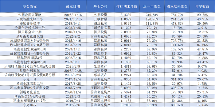中小私募方面,也有多家公司旗下的宏观策略产品近一年的业绩表现较为亮眼。