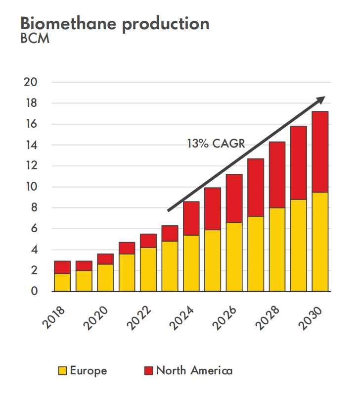 图中显示,2018-2030年期间,欧洲和北美地区生物甲烷数值呈持续增长趋势,复合年增长率为13%。