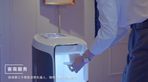 此外,送物机器人还能联动响应房间内语音指令,自主完成物品配送,比如宾客说“帮我送条毛巾”,送物机器人立刻响应,迅速将所需物品送至房间门口,宾客甚至还能通过酒店电视实时查看机器人行进路线,无需人工干预。