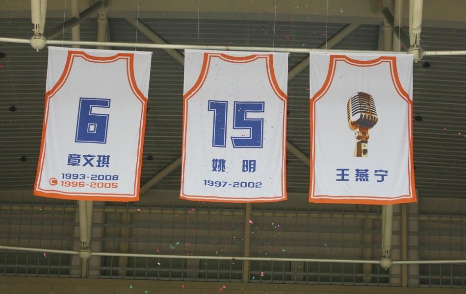 ▼姚明入主上海男篮后曾为章文琪退役球衣,并为解说员王燕宁悬挂起一面旗帜