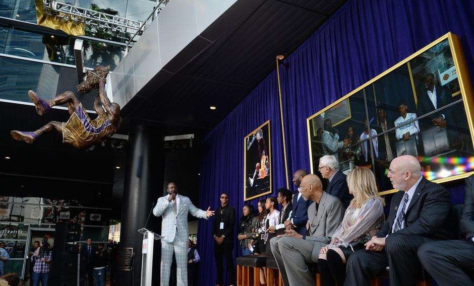 ▼湖人在斯台普斯球馆为奥尼尔树立雕像。奥尼尔成为享有雕像殊荣的第四位湖人名宿