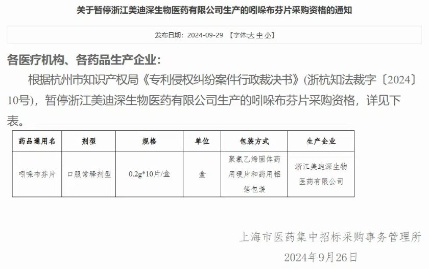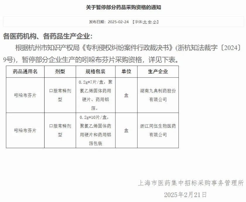 2月24日,上海阳光医药采购网发布公告称,据杭州市知识产权局《专利侵权纠纷案件行政裁决书》(浙杭知法裁字〔2024〕9号),暂停九典制药、同伍生物两家公司的吲哚布芬片采购资格。