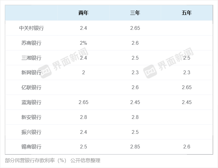 此外,2月初,振兴银行将二年期存款利率调整为2.4%,三年期存款利率调整为2.5%。