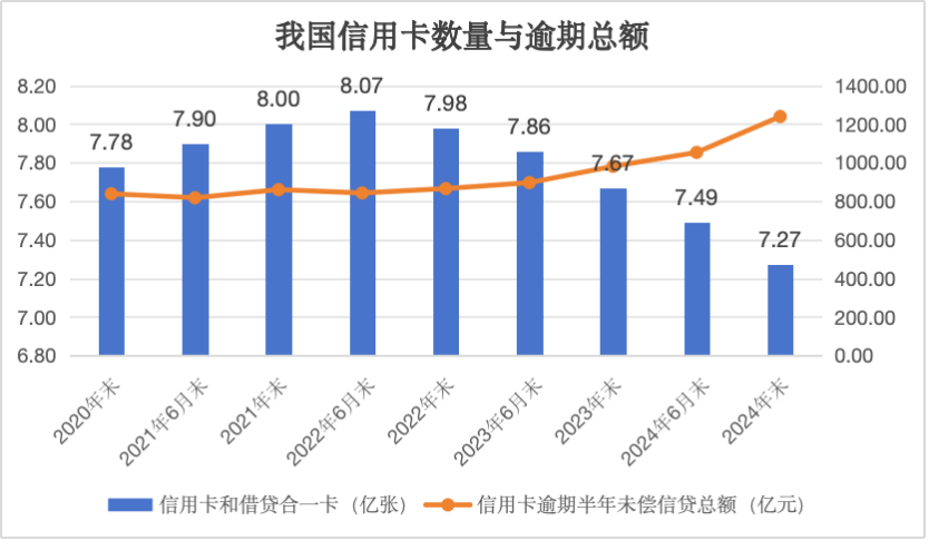 中国人民银行数据显示,我国近年来的信用卡数量高峰出现在2022年,截至2022年6月末,信用卡和借贷合一卡达到8.07亿张,但到2024年末,这一数字急剧下降至7.27亿张,大幅缩减8000万张。