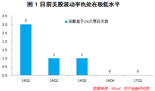 这一状况是极端反常的,因为一般股市估值越贵、波动率越高,现在美股估值水平处在历史第三高,结果波动率反而下降了,太反常了!比如,2016年1季度,标普500日跌幅超过2%的交易日天数有3次,2季度和3季度也各有1次,但进入4季度以来波动率就突然消失了(参见图1)。