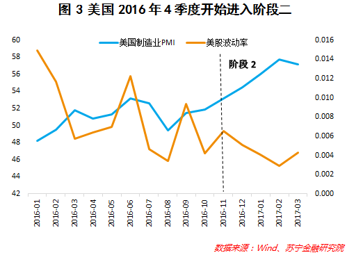 目前,美国PMI从2016年10月开始超过了历史均值51.7的水平,2017年2月数据为57.7,创出了阶段性新高,也即美国经济从2016年4季度开始已经进入阶段二的状态,即PMI从均值逐步上涨到波峰(参见图3)。这一阶段美股波动率出现下降不足为奇,反而符合历史平均规律。但从3月PMI开始掉头向下,预测美国可能进入阶段3。