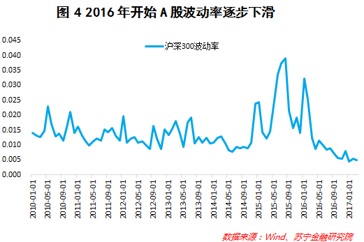 2016年8月,我国制造业PMI已经突破了50的荣枯线,此后便基本保持不断抬升的势头,2017年2月PMI读数为51.6。由此可见,A股波动率的下降也与我国经济不断走强有关。