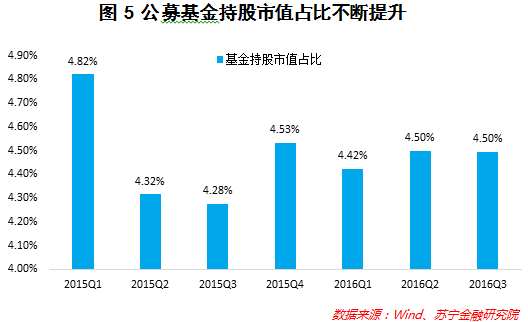 一是机构投资者占比在提升,比如公募基金持股市值占A股流通市值比率在2015年6月股灾以后持续提升(参见图5),而公募基金追求相对收益、一般仓位都会很高。