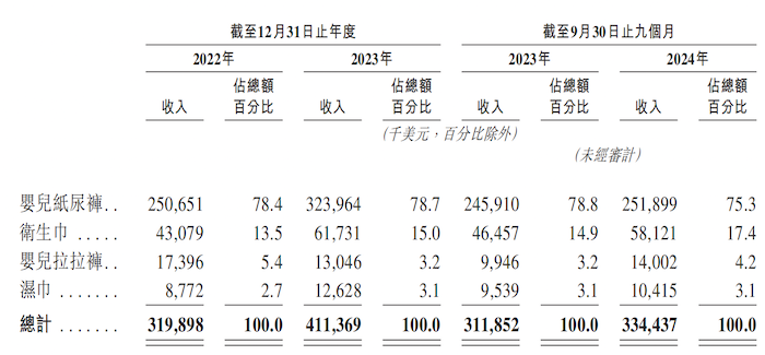 除婴儿纸尿裤外,卫生巾是乐舒适第二大产品,公司产品矩阵中还涵盖婴儿拉拉裤和湿巾等。报告期,纸尿裤以75%以上的收入占比位居第一,卫生巾收入占比13%以上,截至2024年9月30日增至17.4%,婴儿拉拉裤、湿巾收入规模相对较小。