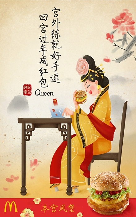 近几年宫廷剧大热,麦当劳也在2017年春节借着宫廷剧来了场大势营销,将新推出的汉堡、饮料等全部在广告中进入宫廷场景,让人忍俊不禁。