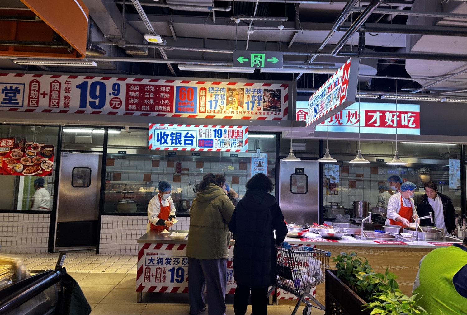 此外,在部分大润发的门店,还引入了平价食堂的餐饮模式。2月28日,界面新闻走访北京大润发西红门店看到,这家大润发引入了莎莎大食堂,这家食堂以19.9元的自助盒饭为特色,还增加了把子肉套餐、肘子肉套餐以及汤类等,吸引了不少附近的顾客。