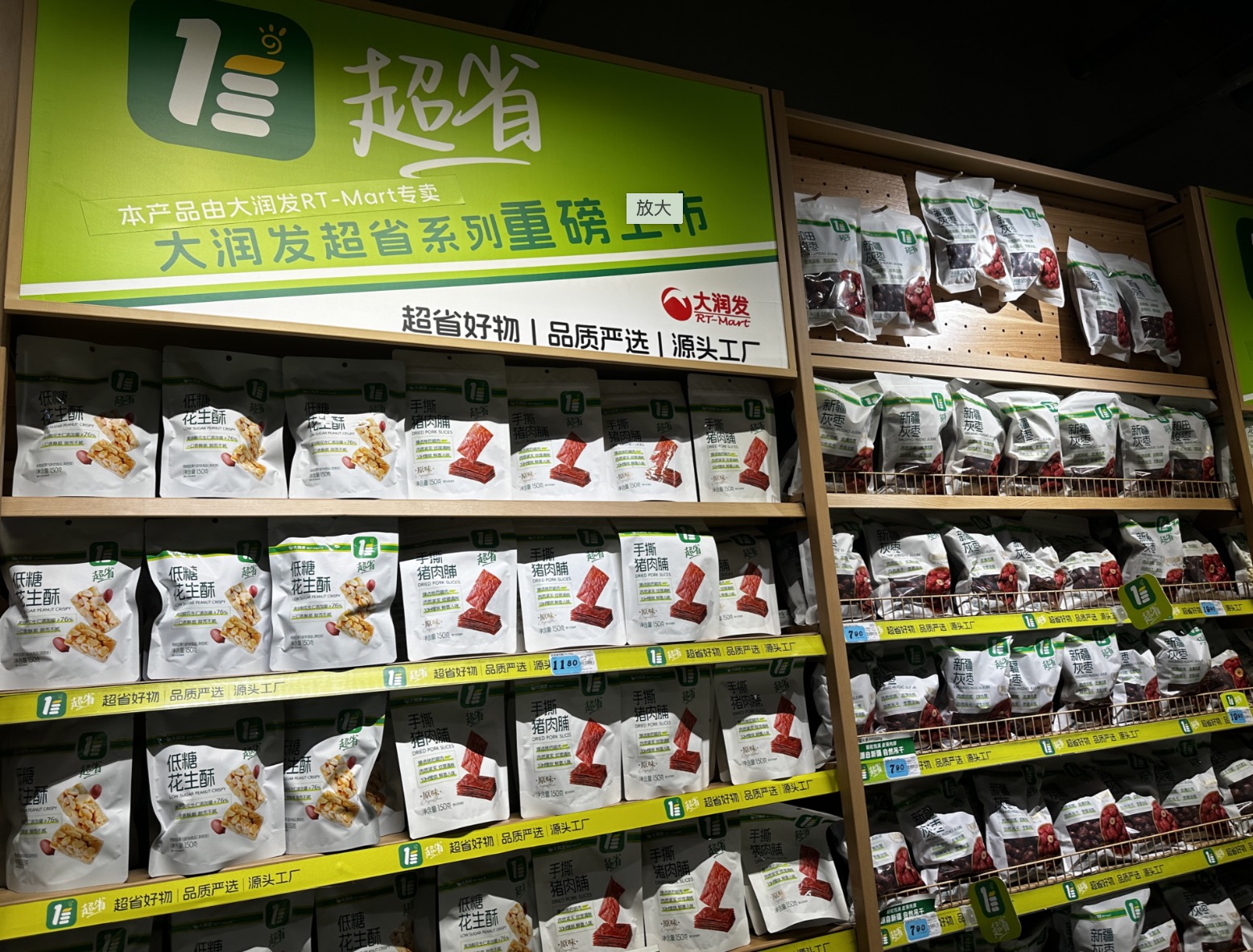 他提出了“重塑价格心智和营收增长”的策略,例如自有品牌商品重回低价路线,和几百个“大润发必买”、“加量不加价”、“天天便宜”系列商品,界面新闻在大润发北京西红门店看到,大润发用一整块区域辟出了“超省”系列区域,产品以日用品和零食、大米、蜂蜜等产品为主。