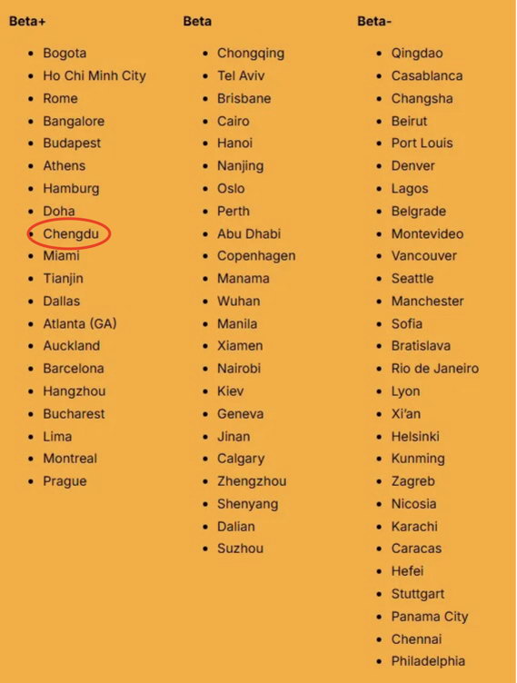 去年10月,全球知名智库GaWC(全球化与世界城市研究网络)发布了《2024世界城市名册》,成都较上期排名提升13个位次,位列全球第58位,中国第7,仅次于北上广深、香港和台北。