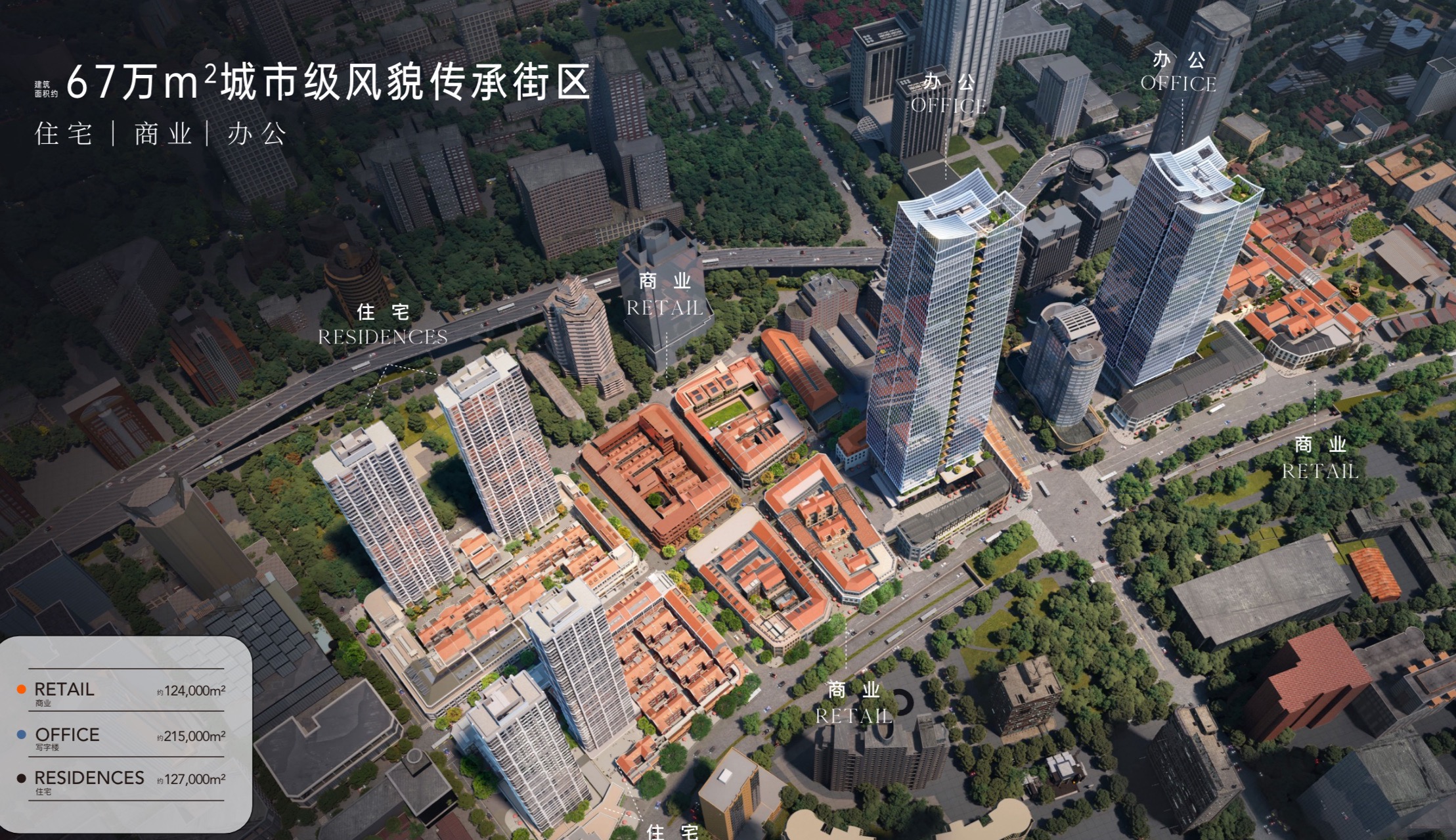 约240米和180米的超高层办公塔楼,与黄浦江对岸的“三件套”遥相呼应;4幢约150米超高层住宅,步行就能到外滩;约1公里长12万平方米的低密风貌商业群落,将是最大的风貌漫步街区之一。