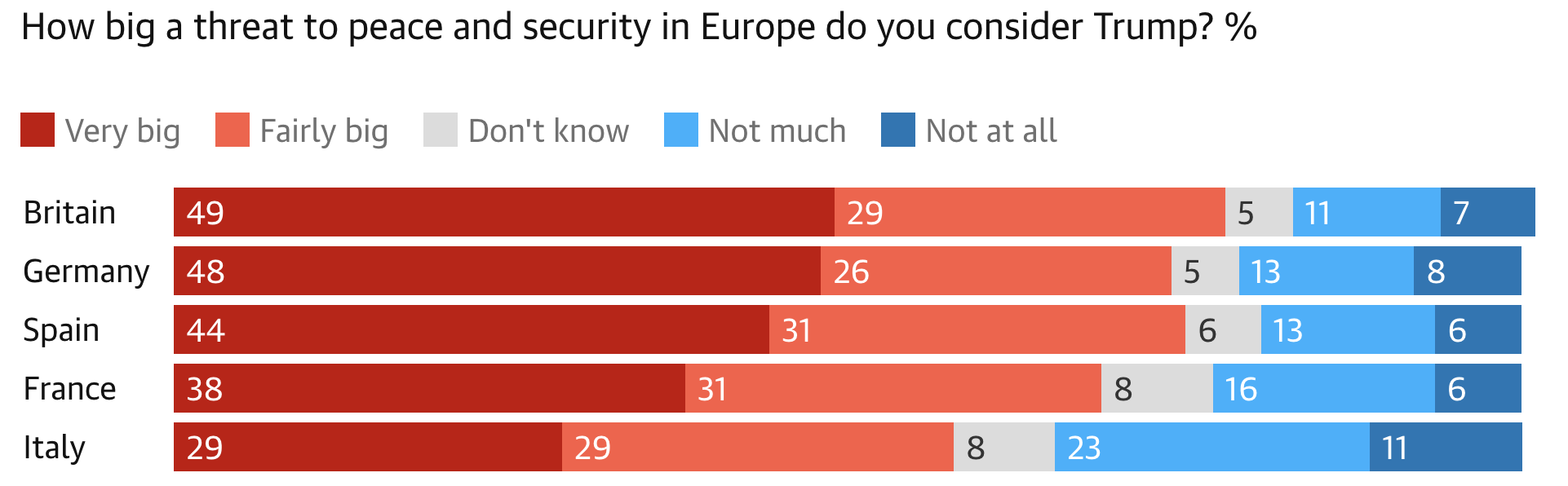 与此同时,舆观调查网(YouGov)对法国、德国、意大利、西班牙和英国这五个西欧主要国家的民意调查显示,绝大多数受访者认为特朗普对欧洲的和平与安全构成威胁。