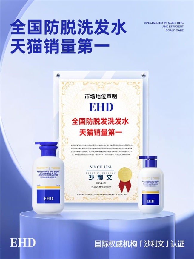 “EHD防脱防断固发洗发水”自推向市场以来,凭借其创新的技术和高效的产品体验,迅速在市场中脱颖而出,成为消费者的热门选择,以实力斩获国际权威机构弗若斯特沙利文认证的"全国防脱发洗发水天猫销量第一"的耀眼成绩,成为为多个平台渠道的爆款,获得百万用户的青睐和认,荣登天猫洗发水年度畅销榜、天猫防脱洗发水加购榜、天猫防脱洗发水热销榜、Bilibili Z100好物榜等多个榜单前列。