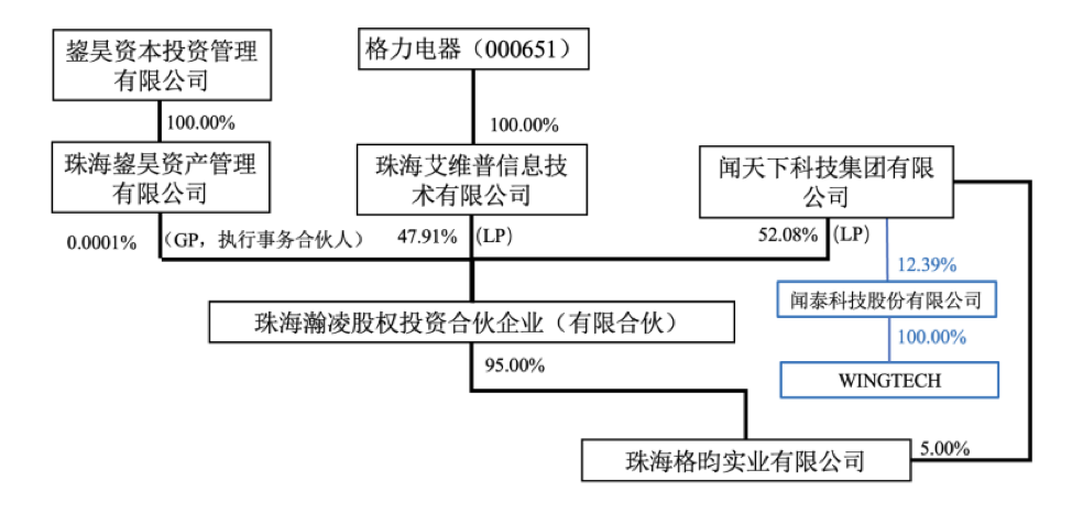 珠海瀚凌的GP是珠海鋆昊资产管理有限公司,独立决定处分合伙企业财产权利等重大事项,还有两个LP分别是闻泰科技控股股东(52.08%)和珠海艾维普信息技术有限公司(47.91%),后者被格力电器100%控制。
