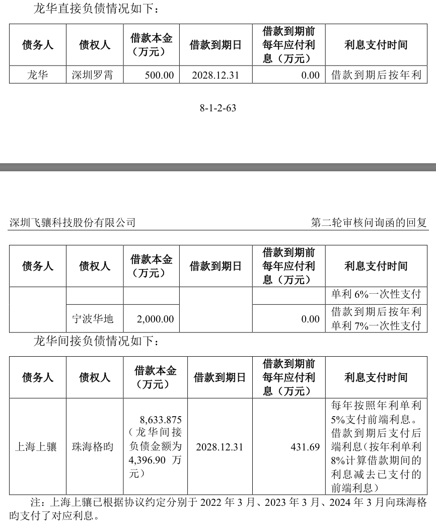 根据披露,飞骧科技实控人龙华个人直接大额负债 (单笔100万元以上)本金为2500万元,主要债权人为宁波华地和深圳罗霄;龙华通过上海上骧间接需承担的大额负债本金为4396.9万元,上海上骧的债权人为珠海格昀,前述借款主要用于受让飞骧科技股份或实缴对飞骧科技的出资。