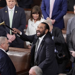 当特朗普提到自己在2024年的当选是近几十年来从未见过的选举胜利时,79岁的得州民主党众议员艾尔·格林(Al Green)突然站起身,举起拄拐指向特朗普,高喊对方“没有获得授权”。特朗普未予理会,格林也继续站着。