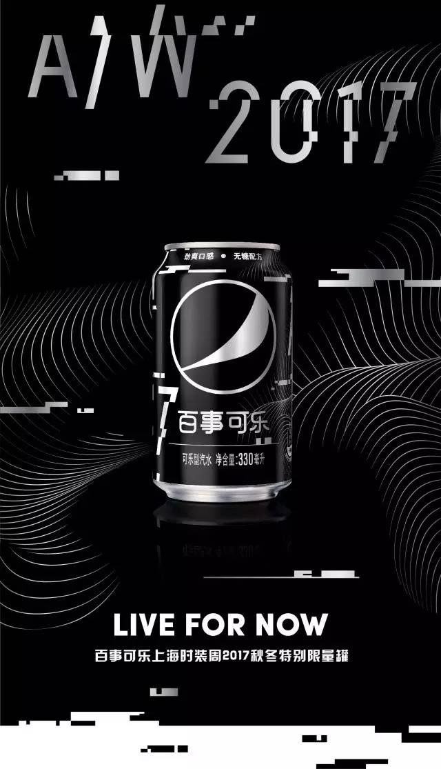 为了配合今年时装周“诗意科技”的主题,百事可乐推出了一款黑白色调、颇有酷炫科技感的限量罐。流线波纹碰撞断层的设计,灵感来自于受到低频干扰的信号波。
