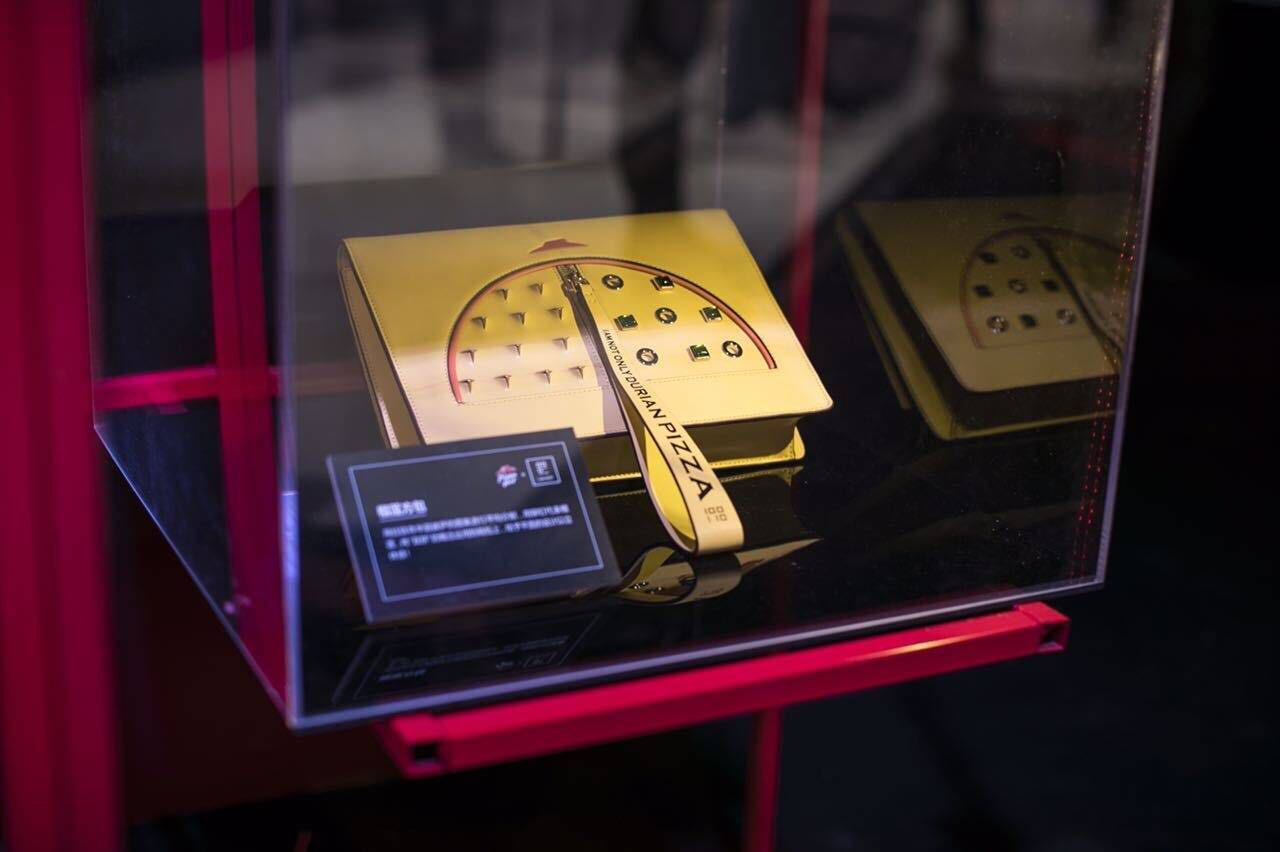 不同于其他品牌走上T台,必胜客办了一场静态展。这场名为“必胜客食尚之旅(Pizza Hut,Journey of Fashion) ”展览,包含7个设计师以披萨为灵感的设计,有首饰、包包、T恤、帽子,以及工作服,比如以榴莲为造型的黄色手包。